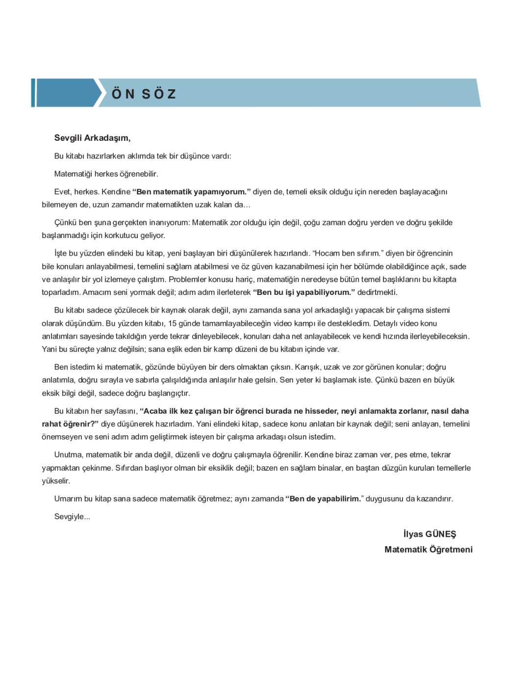Matematiğe “sıfırdan” başlamak isteyenler için özel olarak hazırlanan bu eser, İlyas Güneş rehberliğinde adım adım ilerleyen bir öğrenme süreci sunar. Temel kavramları hiç bilmeyen ya da eksik olduğunu düşünen adaylar için anlaşılır, sade ve öğretici bir dil kullanılmıştır.
